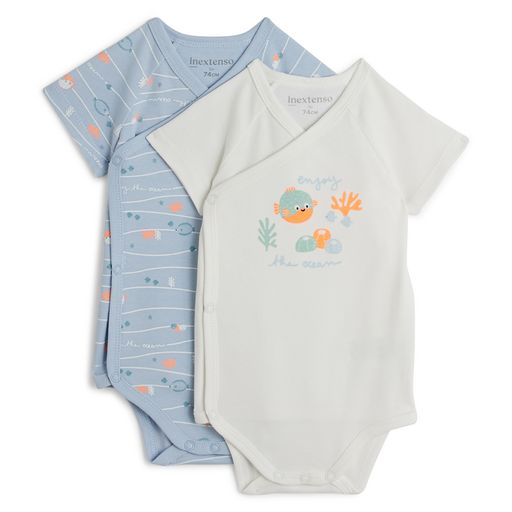 En savoir +Le body à manches courtes est indispensable au confort de bébé ! Ces 2 bodies trop mignons, confectionnés en jersey tout doux 100% coton, possèdent une fermeture croisé par bouton pressons devant et à l’entrejambe pour un habillage facile. Le lot se compose d'un body à motif amusant placé et d'un body imprimé sur le thème de l'océan.