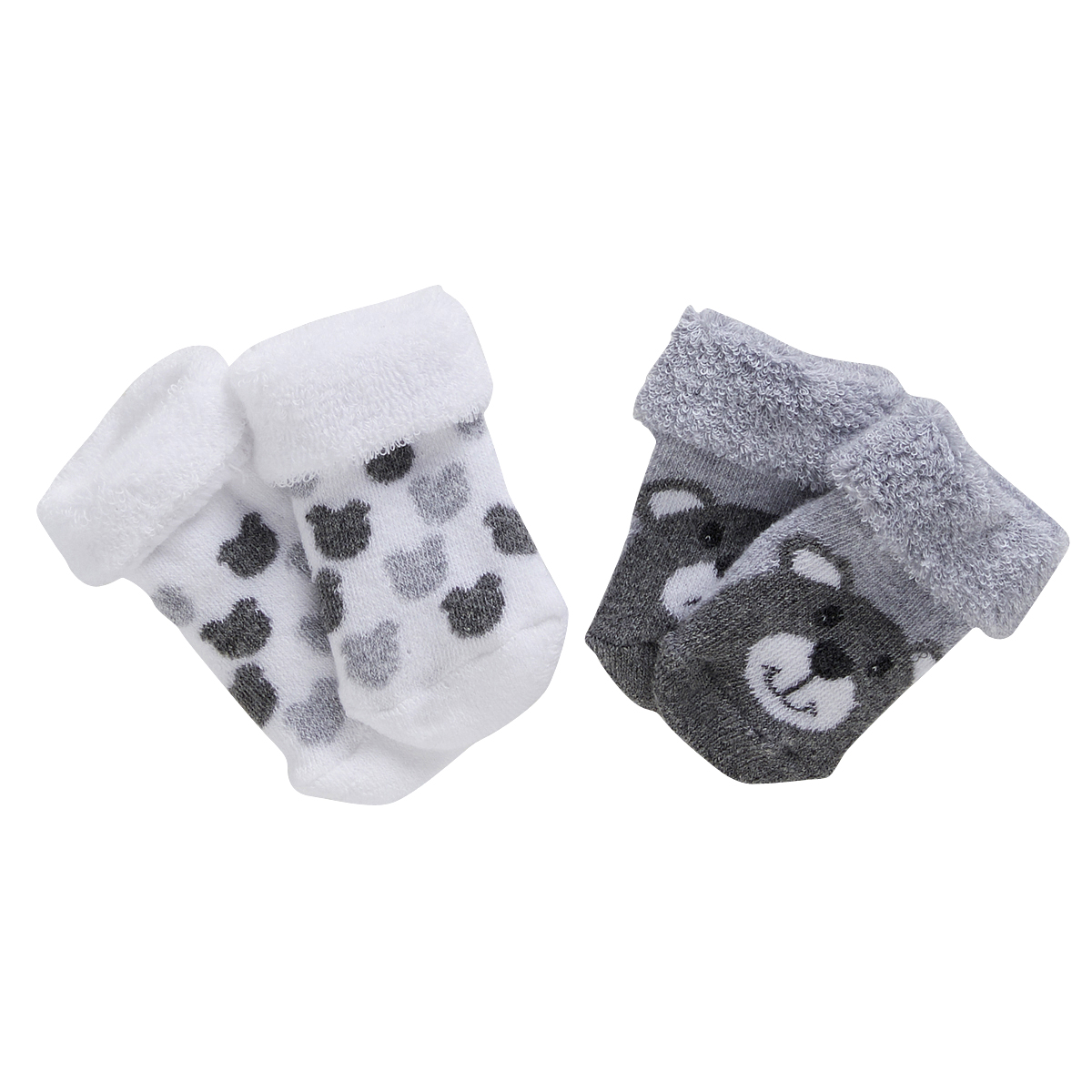 Indispensable dans le trousseau du nouveau-né, ce lot propose deux paires de chaussettes en bouclette : une paire ornée d'une tête d'ourson sur le dessus du pied, et une autre imprimée de petites têtes d'ourson en all-over. Un lot de chaussettes bébé en bouclette aux coloris élégants. Chaussettes