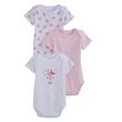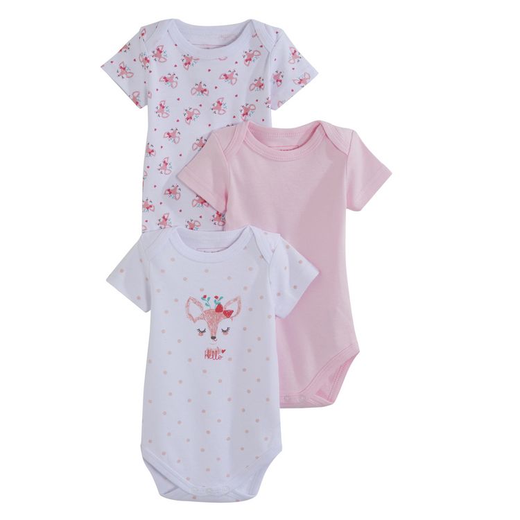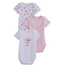 Adorables et confortables, ce lot de 3 bodies bébé à manches courtes plaira aux mamans ! 100% coton, toucher doux. Ce lot associe un body uni et deux bodies imprimés en all-over. Emmanchures américaines et pressions à l'entrejambe facilitant l'habillage de bébé. Ce lot de 3 bodies bébé fille e