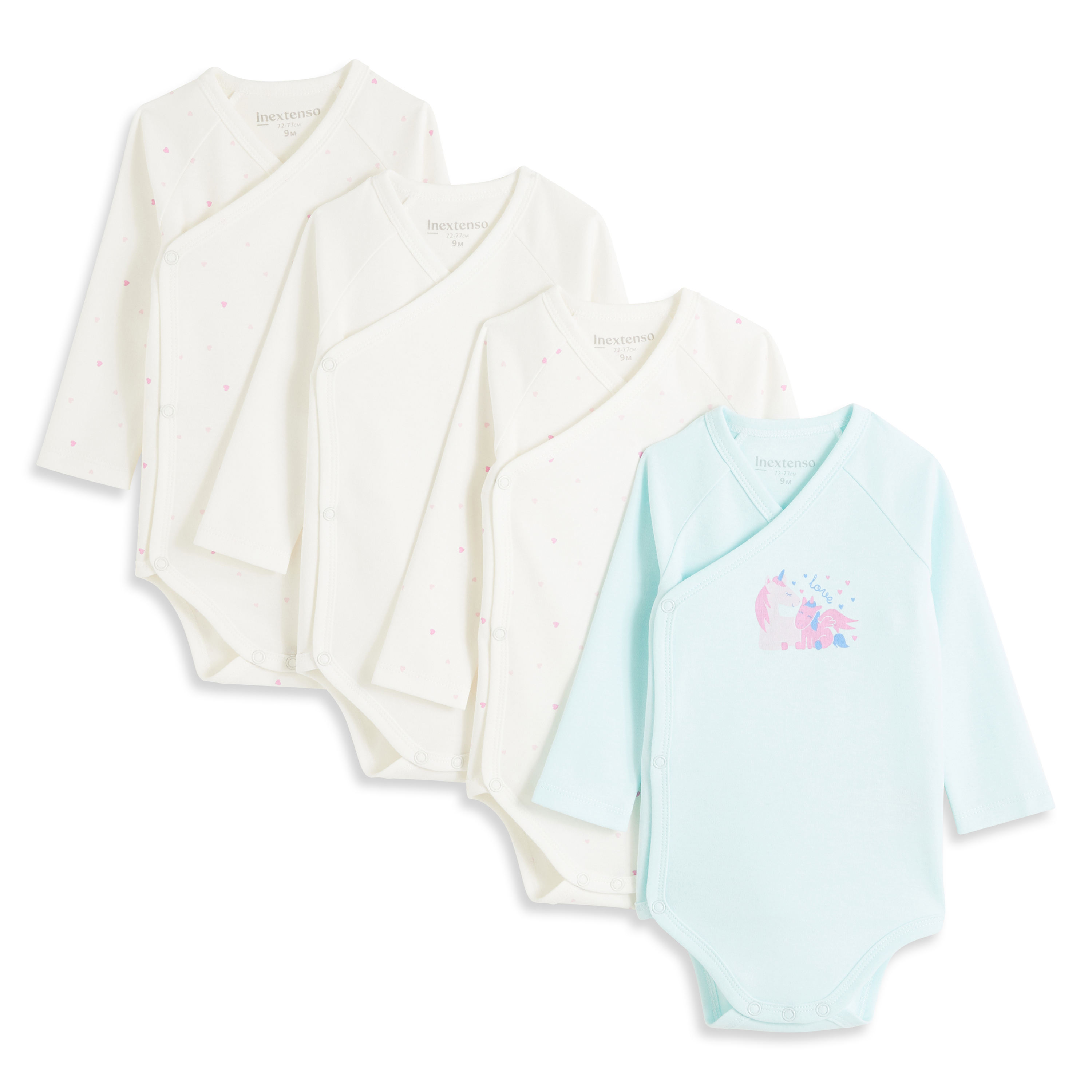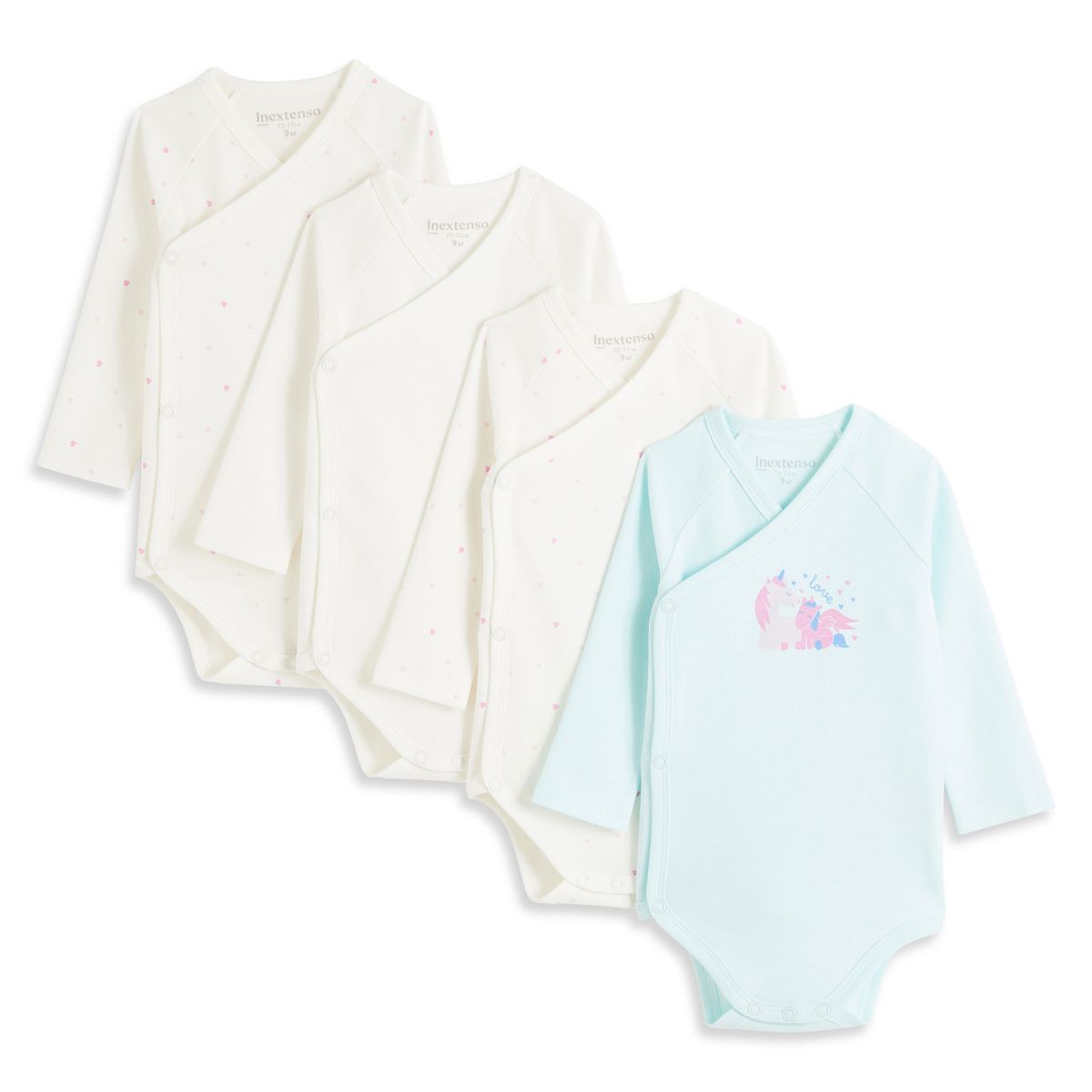 En savoir +Indispensables au confort de bébé, le body à manches longues en pur coton apporte un supplément de chaleur et de douceur. Ce lot de 4 bodies forme croisée est hyper craquant et est idéal dès la naissance : l’ouverture croisée pressionnée permet un change et un habillage facile même pour les tout petits bébés. On craque pour les motifs très tendres ! Ce lot est composé d’un body uni, de 2 bodies à imprimé cœurs, et d'un body avec un motif dinosaure et licorne placé devant.