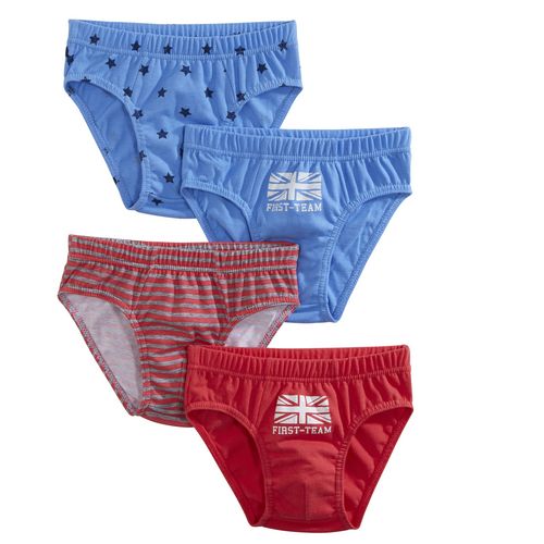 Ce lot de 4 slips garçon rime avec douceur et confort. 100% coton. Taille élastiquée assurant un bon maintien. Imprimés fantaisie. Ce lot de 4 slips garçon est facile d'entretien.
