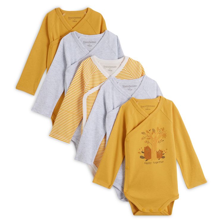 Indispensables au confort de bébé, le body à manches longues en pur coton apporte un supplément de chaleur et de douceur. Ce lot de 5 bodies à manches longues est hyper craquant et idéal dès la naissance ! L’ ouverture croisée pressionnée permet un change et un habillage facile même pour les t
