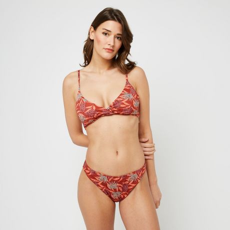 Composé d’un soutien-gorge brassière sans armatures avec de fines bretelles et d’un tanga assorti avec taille et de tours de cuisses élastiqués, ainsi qu’un fond doublé et d’une matière extensible pour le confort. Côté style, ce maillot de bain 2 pièces affiche un imprimé ten