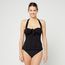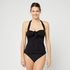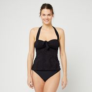 En savoir +Ce maillot de bain noir 2 pièces, forme tankini, a l’avantage de masquer discrètement les imperfections tout en sublimant votre silhouette. Cette pépite à adopter sans hésiter se démarque par sa touche imprimée jacquard sur le devant, son slip de bain uni, ses liens à nouer autour du cou et son nœud fantaisie à l’entrebonnet.