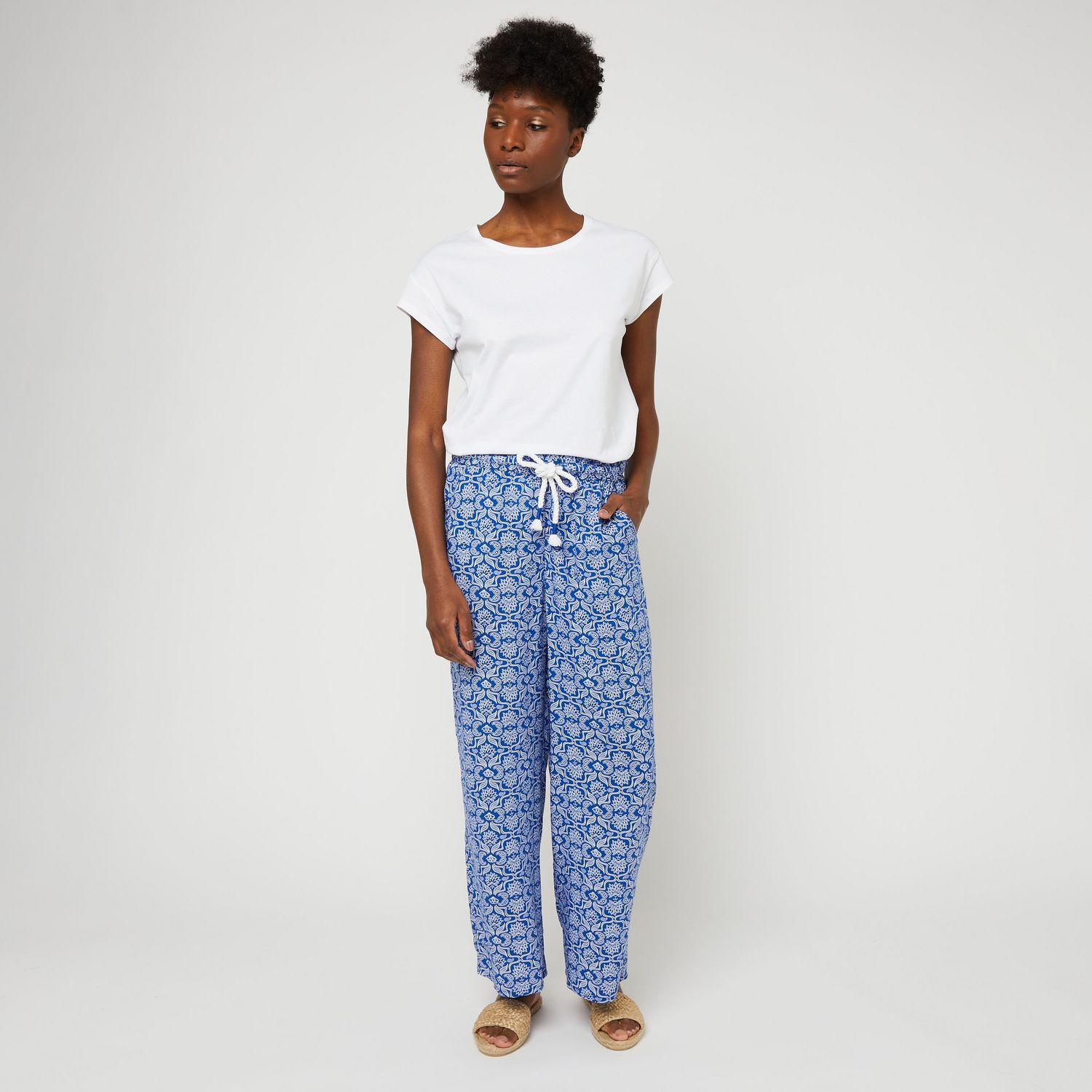 En savoir +Avec sa taille élastiquée, ses liens à nouer avec perles fantaisie et son imprimé graphique, ce pantalon offre un style décontracté. Sa coupe large et sa matière fluide en viscose assurent une touche de confort supplémentaire au porté. Ce modèle est l’atout de la saison que l’on aime porter avec un haut uni et des sandales.