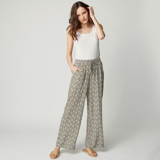 En savoir +Souple et léger, ce pantalon vert kaki en viscose séduit par sa ceinture avec cordons de serrage pour un porté confortable, ses 2 poches latérales et sa coupe droite avec bas de jambes larges. On craque pour sa matière fluide agréable à porter en été et son imprimé allover facile à combiner avec un petit haut uni assorti.