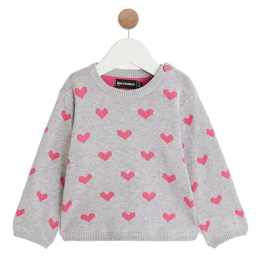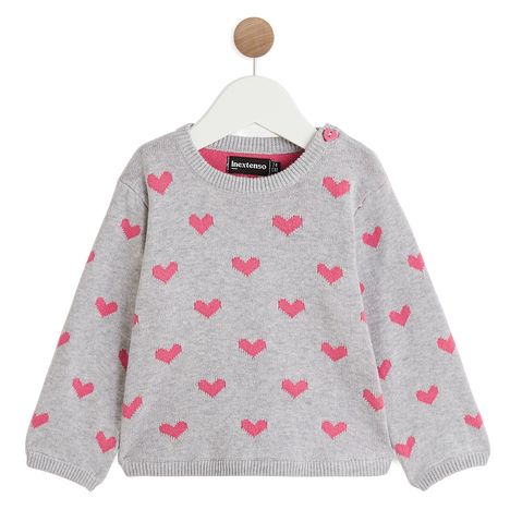 Allié idéal pour réchauffer les tenues de bébé, ce pull jacquard affiche une maille toute douce animée de jolis cœurs tendance. Facile à coordonner, il mise sur une encolure ronde fermée par un bouton fantaisie et des finitions bord-côtes. Ce basique est la pièce idéale qui mixe douceur, chale