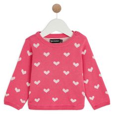 En savoir +Allié idéal pour réchauffer les tenues de bébé, ce pull jacquard affiche une maille toute douce animée de jolis cœurs tendance. Facile à coordonner, il mise sur une encolure ronde fermée par un bouton fantaisie et des finitions bord-côtes. Ce basique est la pièce idéale qui mixe douceur, chaleur et style !