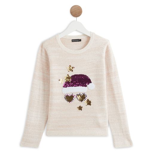 Un pull de Noël pour les petites filles animé de jolis motifs en sequins pailletés placés devant : incontournable pour cette saison ! Il est réalisé en tricot doux et chaud. Avec son col rond, on note les finitions bords-côtes.