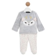 Nuits chaudes et douillettes assurées pour bébé avec ce pyjama 2 pièces en maille peluche hyper douce. Le haut du pyjama possède une ouverture pressionnée au dos, une tête de renne trop mignonne s'affiche devant avec des oreilles et cornes en relief, un col rond et des manches longues raglan. Le pan