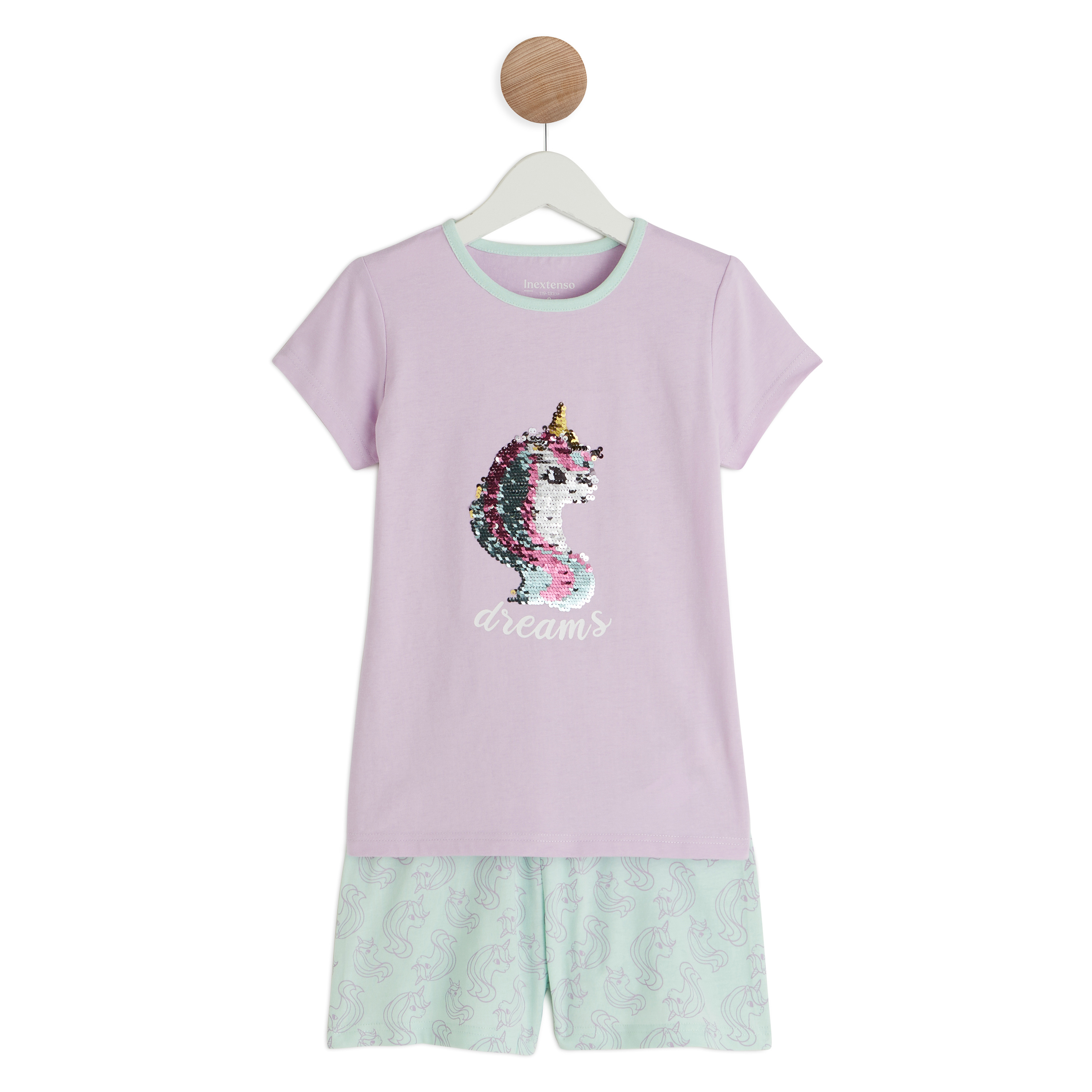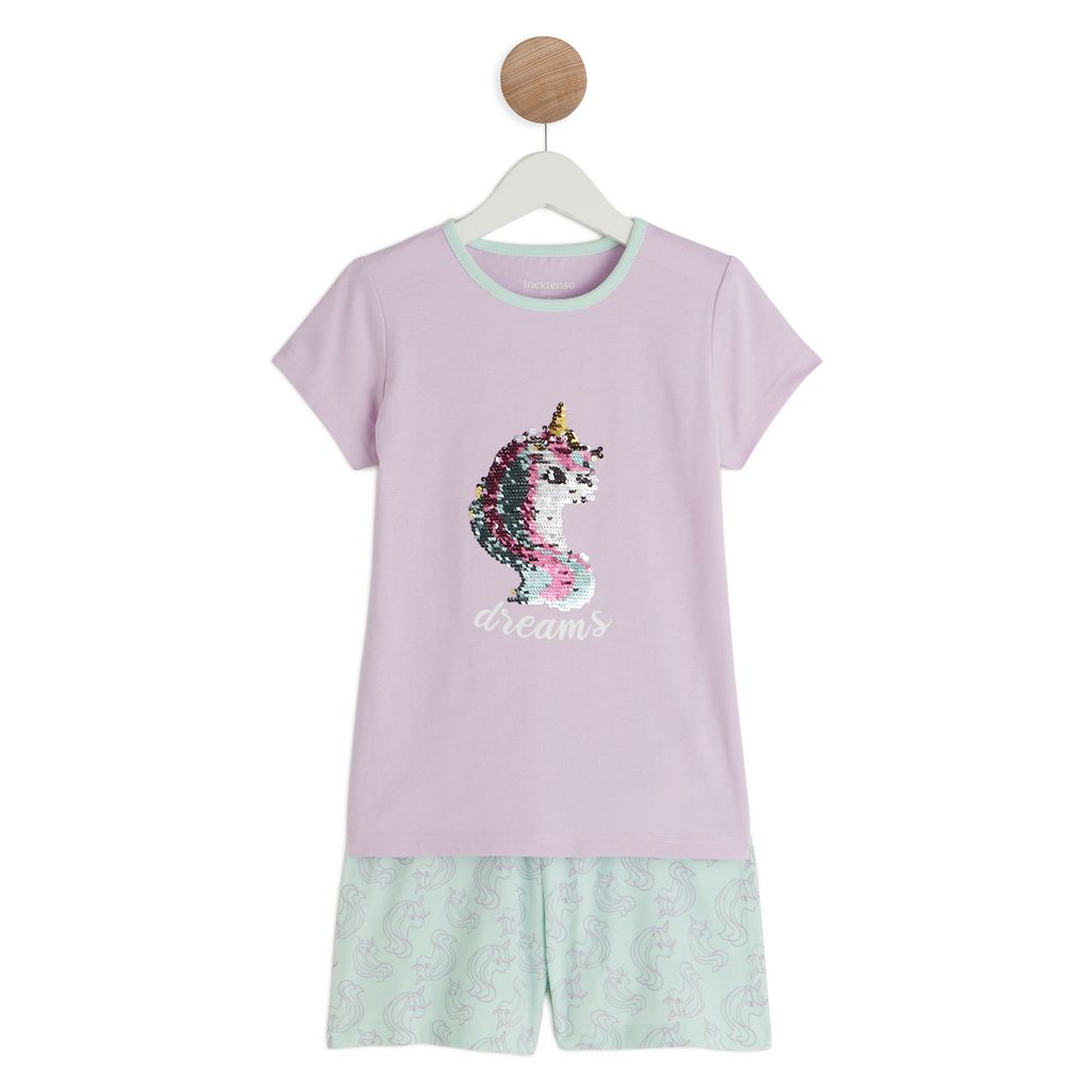 Un pyjacourt esprit licorne un brin sauvage, qui tombe à pique pour les nuits douces de la belle saison ! Cet ensemble est composé d'un t-shirt à manches courtes avec grand motif à sequins, et d'un bermuda assorti à taille élastiquée.