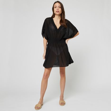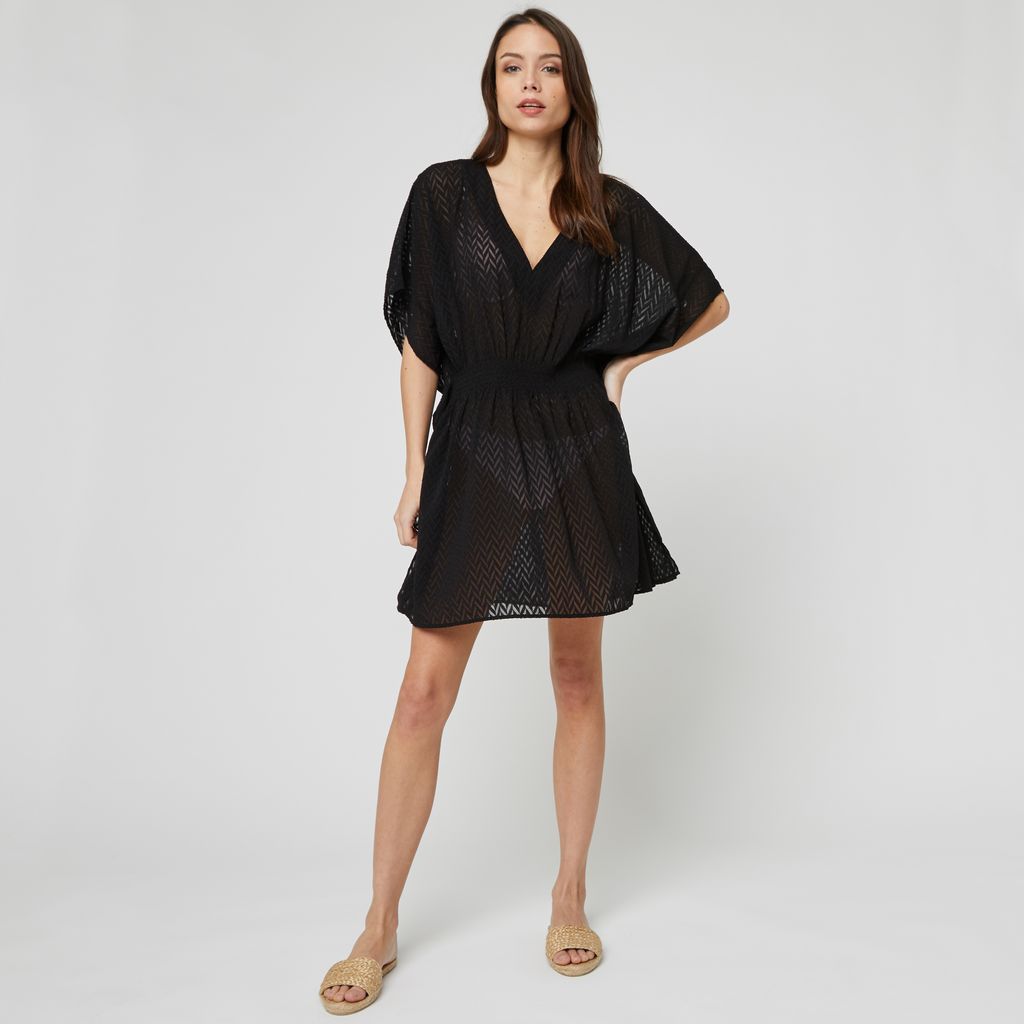 En savoir +Facile à enfiler, cette robe de plage unie joue la carte de l’originalité avec sa matière légèrement transparente, son motif chevrons ton sur ton et sa taille élastiquée. On aime sa ligne courte, ses larges emmanchures et son décolleté V pour plus de féminité. Côté style, on la combine avec des mules, des nu-pieds ou des sandalettes compensées selon la tendance du moment.
