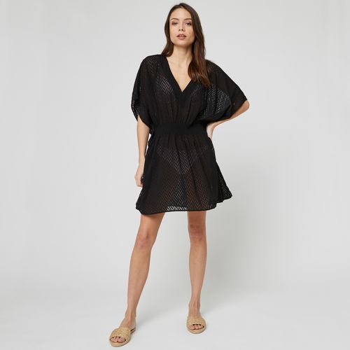 Facile à enfiler, cette robe de plage unie joue la carte de l’originalité avec sa matière légèrement transparente, son motif chevrons ton sur ton et sa taille élastiquée. On aime sa ligne courte, ses larges emmanchures et son décolleté V pour plus de féminité. Côté style, on la combine avec de