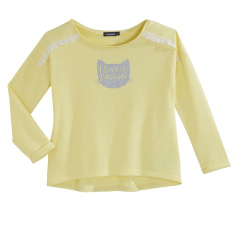 Ce sweat jaune illumine la silhouette des filles : elles adorent ! Réalisé en molleton léger et confortable. On aime le motif pailleté sur le devant et les bandes brodées sur les épaules. Col rond, manches longues avec revers, base légèrement arrondie et plus courte sur le devant. Ce sweat fille est lavable en machine à 30°.