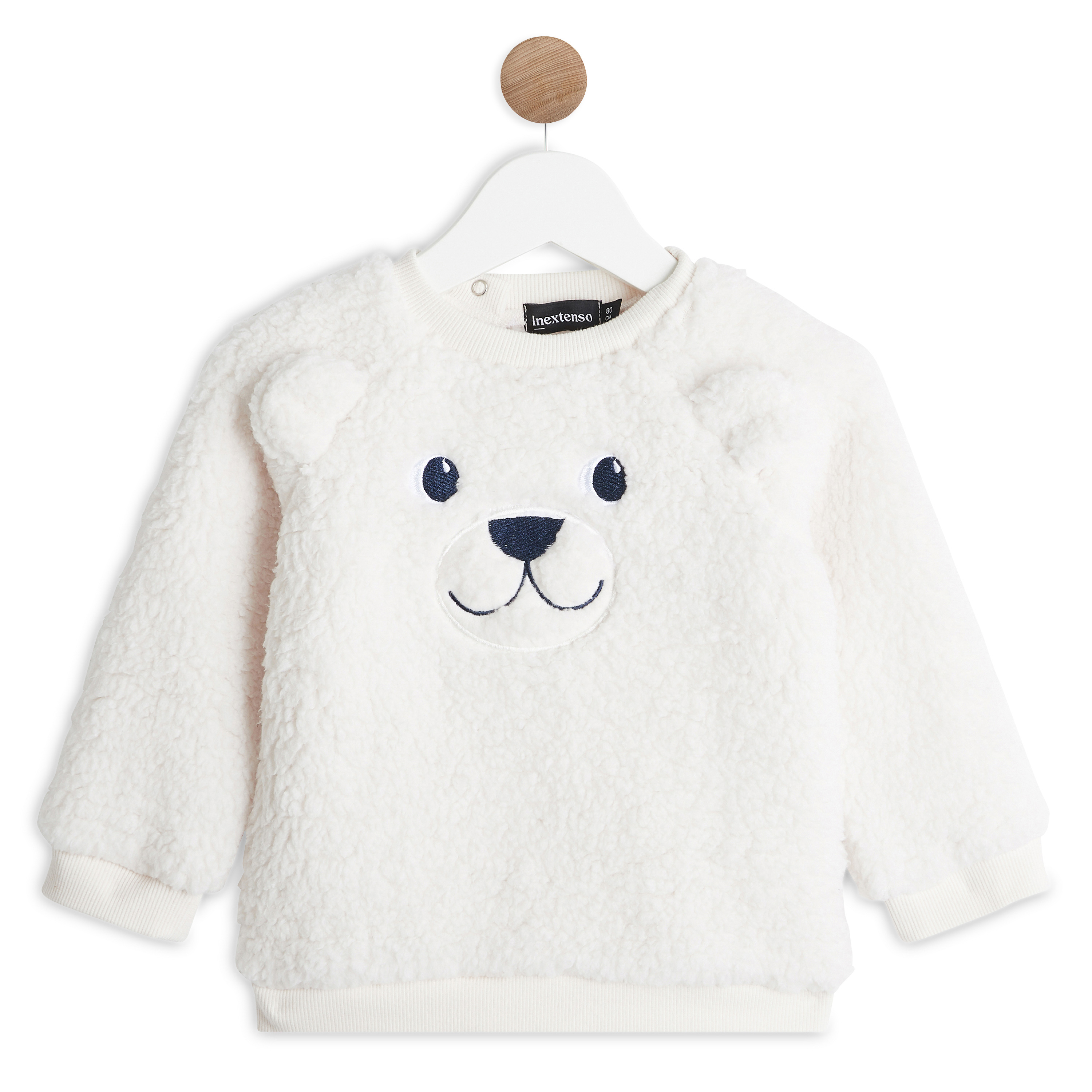 Qu'il est mignon cet petit sweat en sherpa hyper confortable et chaud ! Il affiche un tendre motif ours brodé devant avec des oreilles en relief. Le sweat possède des manches raglan et des finitions bord-côtes. Le col est pressionné au dos pour faciliter l'habillage.