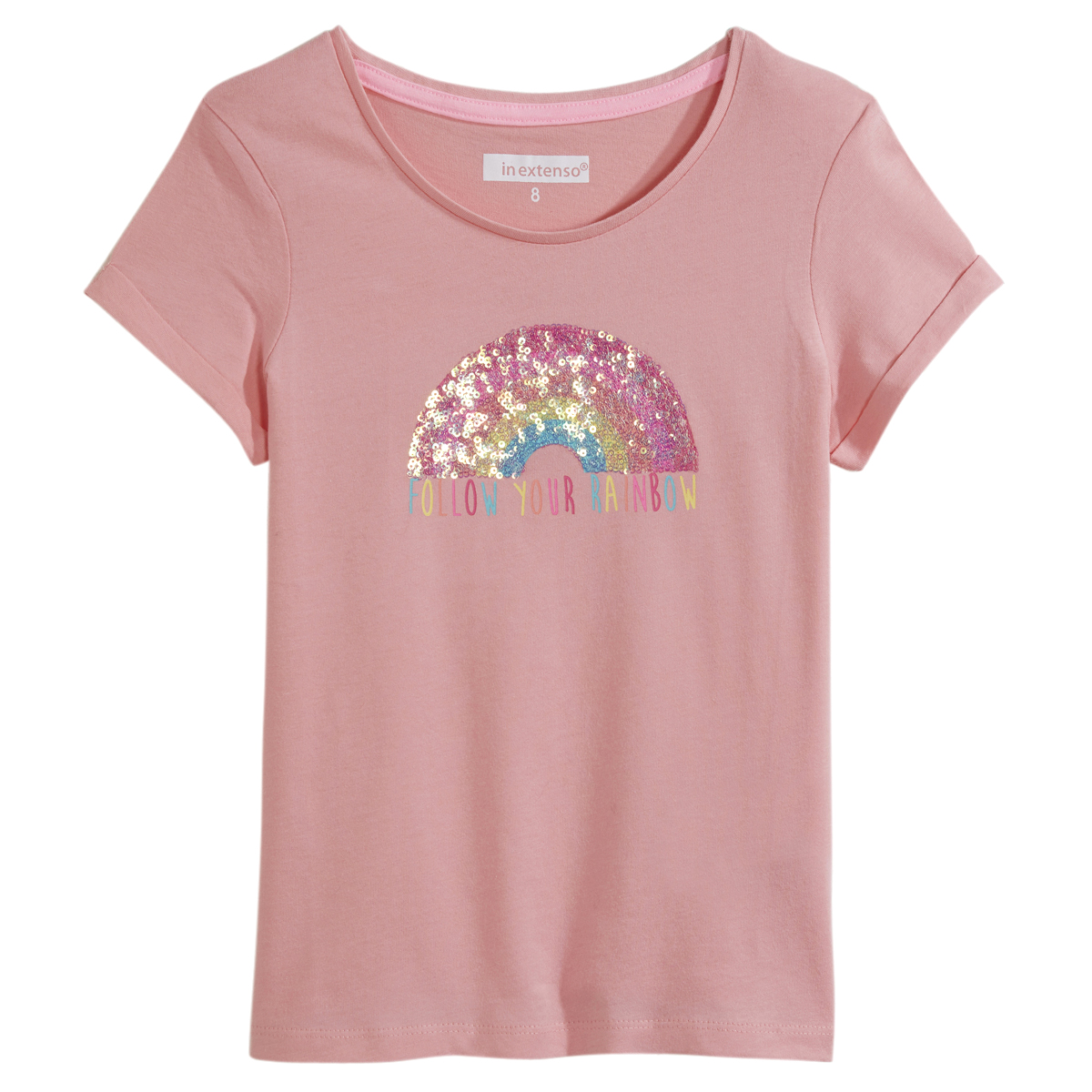 On colore la silhouette des filles avec ce tee-shirt décoré d'un arc-en-ciel en sequins ! Le plus : arc-en-ciel en sequins brillants sur le devant. 100% coton. Confortable. Toucher doux. Col rond, manches courtes à revers. Il n'y a pas d'étiquette dans le cou pour plus de douceur. Ce t-sh
