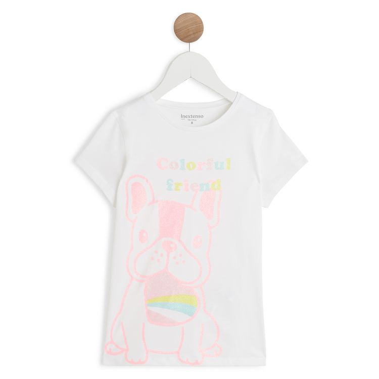 Les petites filles se sentent girly dans ce superbe t-shirt à manches courtes imprimé d'un joli chien pailleté devant ! Avec son col rond sans étiquette dans le cou, ce t-shirt est agréable à porter et est très facile d'entretien avec sa conception en jersey 100% coton !