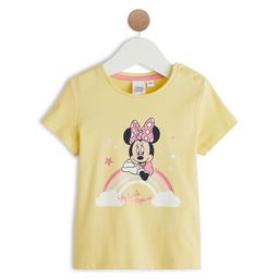 On craque pour ce t-shirt à manches courtes jaune, et son grand motif Minnie avec un arc-en-ciel sur le devant ! Parfait pour l'été, ce t-shirt léger possède des manches courtes et une encolure ronde boutonnée et bien extensible pour faciliter l'enfilage.