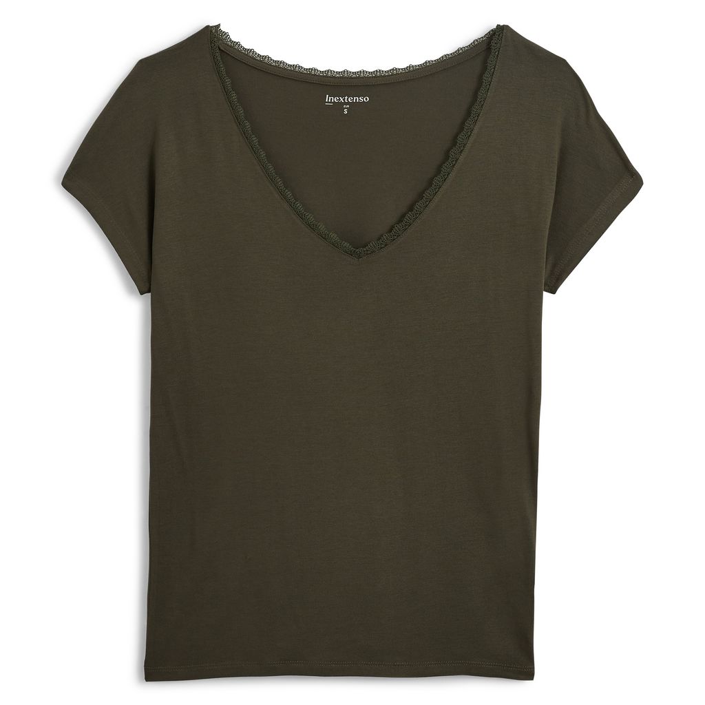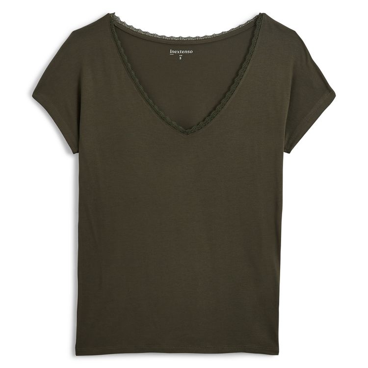 En savoir +Les détails dentelle de ce t-shirt à manches courtes col v apportent un vrai plus à ce haut uni ! Il se porte facilement avec un jean ou une jupe.
