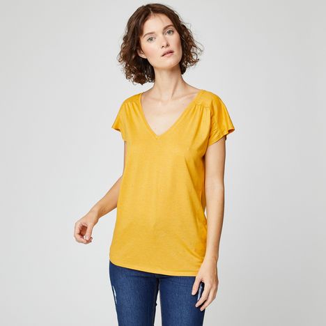 En savoir +Avec sa coupe loose et son col v, ce t-shirt vous donnera une allure super tendance cet été ! Il se marie à merveille avec un jean, un pantalon ou une jupe.