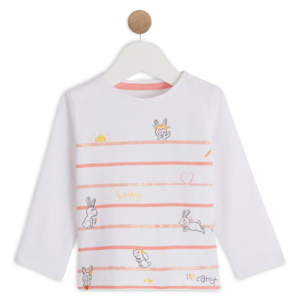 Bébé va adorer porter ce t-shirt à manches longues, avec son motif rayé accompagnés de lapins trop mignons imprimés sur le devant ! Ce t-shirt possède une encolure arrondie finition bords-côtes, et une ouverture pressionnée sur l'épaule pour un enfilage facile. Sa matière en jersey 100% coton est do