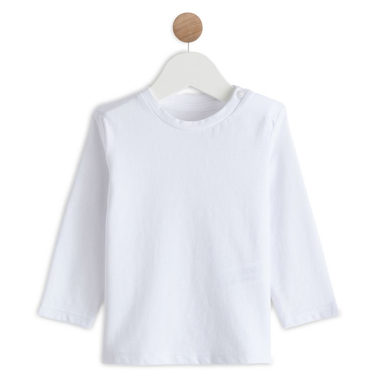En savoir +Confectionné en jersey tout doux 100% coton, ce t-shirt uni à manches longues est un basique indispensable au confort de bébé ! Il possède un col rond et une ouverture boutonnée sur l’épaule pour un enfilage facile.
