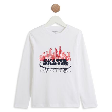En savoir +Pièce maîtresse du vestiaire de nos petits trésors, ce t-shirt en pur coton est agréable à porter. Avec son col rond et ses manches longues, il se matche facilement avec un jean ou un chino, seul ou en duo sous une chemise pour un style décontracté. Original, il se remarque par un grand motif sur le devant pour dynamiser les tenues !