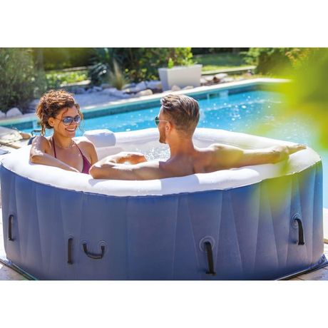 Ce systeme de spa d'exterieur est gonflable et la pompe et le systeme de filtre sont bien caches dans la paroi du spa. Outre le fait qu'il presente un design magnifique et elegant dans une palette de couleurs anthracite et blanc perle, le spa d'exterieur est egalement peu encombrant.