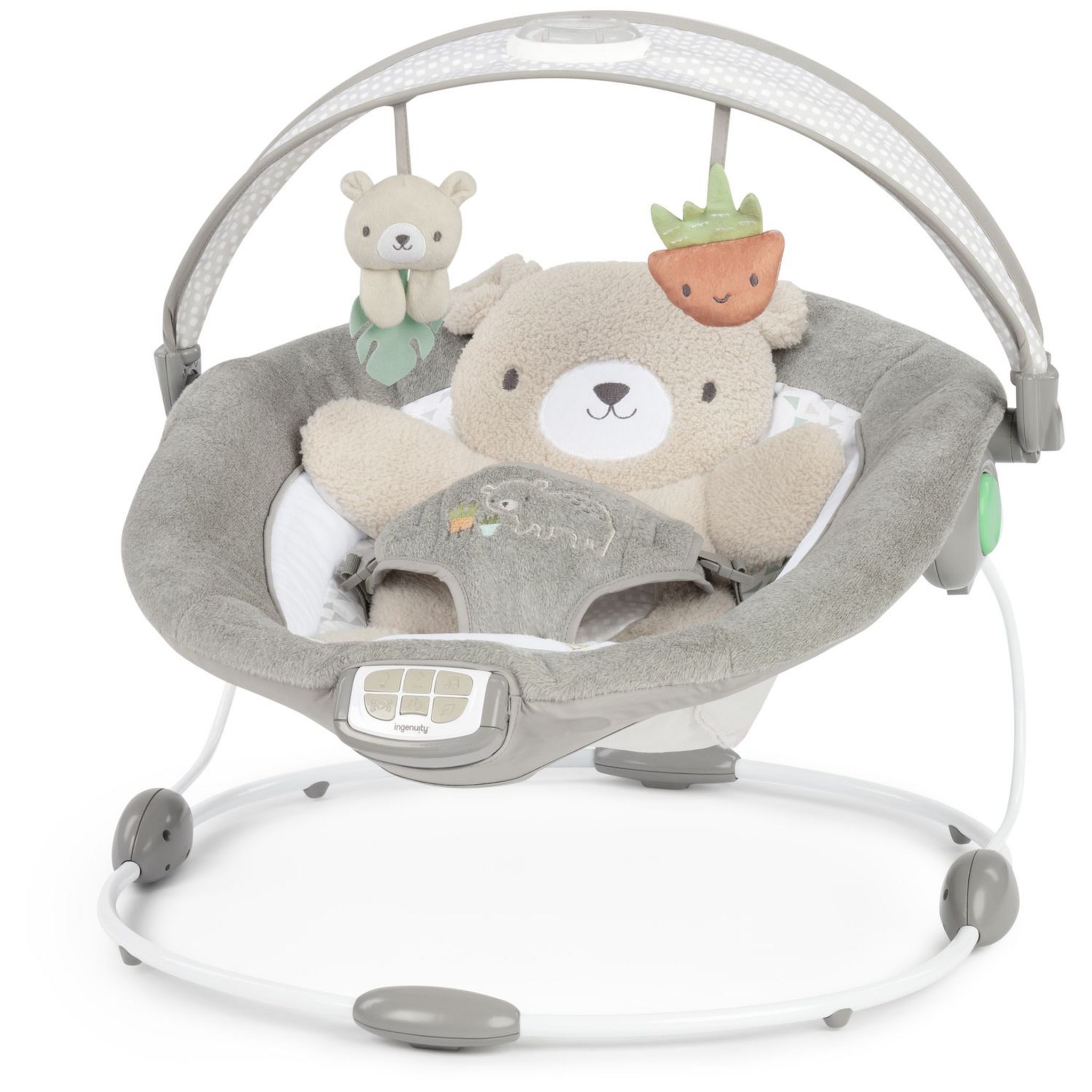 Ce transat Ingenuity InLighten Bouncer - Nate est idéal pour les parents très occupés, bébé est en sécurité. Pour les plus petits jusqu'à 6 mois ou 9kgs; âge ou poids max., Idéal le traversin petit ours (Nate) pour encore plus de support et confort. Traversin amovible tout doux à utiliser comme doudou. Siège totalement inclinable pour encore plus de confort, Avec arc d'activités lumineux et clignotant apaisant pour jouer; 2 jouets en peluche amusants inclus (un ours et une plante) bébé apprend à toucher et attraper, Stimulation des sens avec des vibrations douces, apaisantes, des airs calmes, sons nature et bruits blancs. Fonctionne avec 3 piles C (non incluses), Conception sécurisée et confort assurée; avec harnais 3 points d'attache bébé est en sécurité; housse de siège et traversin nettoyage facile, dimensions totales 62 x 60 x 59cm