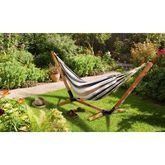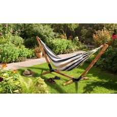 Hamac bois + toile. Dimensions globales hamac : Hauteur 100 x Largeur 90 x Longueur 310 cm 2 fixations en métal noir au niveau des pieds Epaisseur bois : 5cm 4 pieds en bois de longueur 43cm Longeur entre les 2 paires de pieds : 105cm Longueur des support bois : 130cm Toile hamac : Longeur 200cm x Largeur 150cm Corde beige Composition : 65% Coton, 35% Polyester - 320gr/m² Poids maximal : 160kgs"