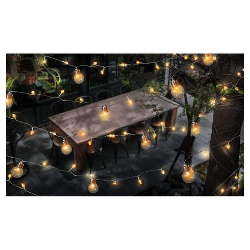 Guirlande solaire 100LEDs + 11 ampoules blanc chaud. Idéale pour décorer vos extérieurs, elle s'illuminera à la tombée de la nuit.