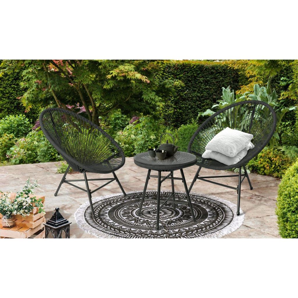 Cet ensemble de jardin se compose d'une table et deux fauteuils "oeufs" _Couleur : Gris _Matériaux : _Structure en tubulaire Acier 20mm et plastique. _Plateau table en verre trempé 5mm _Dimensions fauteuil : L 73 x P. 66 x h. 83cm / h. dossier 59 cm _Précision dimensions assise : h. 41,5cm / P. 40cm _Dimensions Table : Diamètre : 45cm / h. 46,5cm _Poids du produit : 11 kilos _Dimensions du colis : 81 x 71 x 36cm _A monter soi-même : Oui