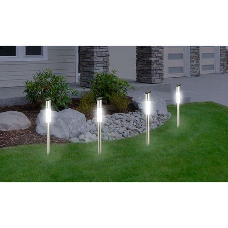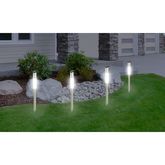 Lot de 4 sticks LED solaires _Dimensions (DiaxH) : 5.2x61.5cm _Matière : Inox + polypropilène _Couleur : argent _A monter soi-même : non _Poids du produit : 0.57 kg _Dimensions du colis : 41 x 11.5 x 9 cm _Informations supplémentaires : _1x LED blanche _Autonomie : jusqu'à 8 heures _Résiste aux projections d’eau (Certification IP 44) _Pile bouton rechargeable NiMH 2v 40mAh _Panneau solaire amorphe (25x25 mm)