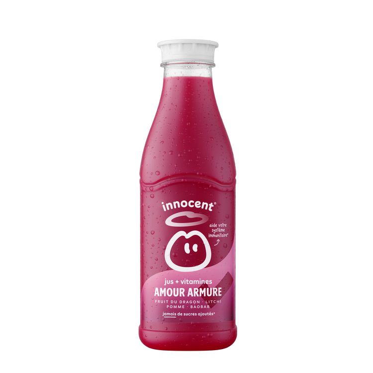 "Ce jus innocent plus est composé de fruits, de légumes, de plantes et vitamines pour vous aider à vous sentir tip top et à profiter de la vie. Et d'ailleurs, dans la vie, tout est possible. Prenez ce jus rose amour armure. Vous saviez qu'il était possible de faire un jus de fruits vitaminé aussi rose qu'un flamant rose avec seulement des ingrédients naturels ? Il suffit de mettre du fruit du dragon rose avec du litchi, de la pomme, du baobab et des vitamines. Et en plus, c'est bon. C'est fou non ?