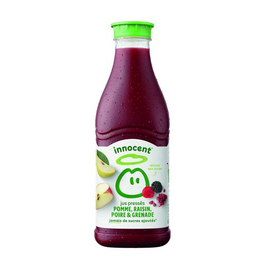 Chez innocent quand on aime on ne compte pas. Mais nos jus, on les aime tellement qu’on compte un peu quand même. Par exemple, dans celui-ci, on a pressé très précisément 5 pommes pressées, 34 raisins pressés, 19 framboises, 1/3 poire, 1/4 grenade pressée, 20 cassis pressés, 3 1/2 mûres, une lichette de jus de citron, un soupçon de jus de betterave. On espère que vous aimerez autant que nous ce jus de pomme raisin poire grenade. Parfait pour votre petit-déjeuner.