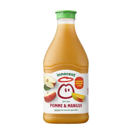 Les pommes sont délicieuses, les mangues sont délicieuses, alors devinez ce qu'on a fait ? Exactement. On en a fait un jus innocent délicieux. Bravo à tous ceux qui ont trouvé la bonne réponse. Ah et on a oublié de vous dire, ce jus orange mangue est délicieux pour votre petit déjeuner.