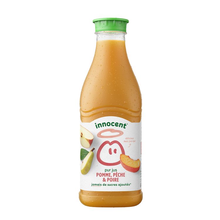 Chez innocent, on fait des boissons saines et délicieuses. Et depuis notre création on n'a jamais changé notre façon de faire. C'est pourquoi ce jus innocent est composé de pommes, pêches et de poires pressées, d'un zeste de vitamine C et rien d'autre. C'est tout ce qu'il faut pour faire un jus pomme poire pêche, délicieux qui va vous régaler (en toute objectivité bien sûr). Parfait pour votre petit déjeuner.