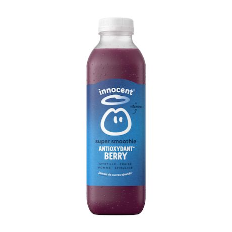 Ce super smoothie innocent est un mélange de fruits écrasés, d'eau de pomme, de jus de fruits, d'extraits de légumes, d'extrait de spiruline, avec vitamines ajoutées.