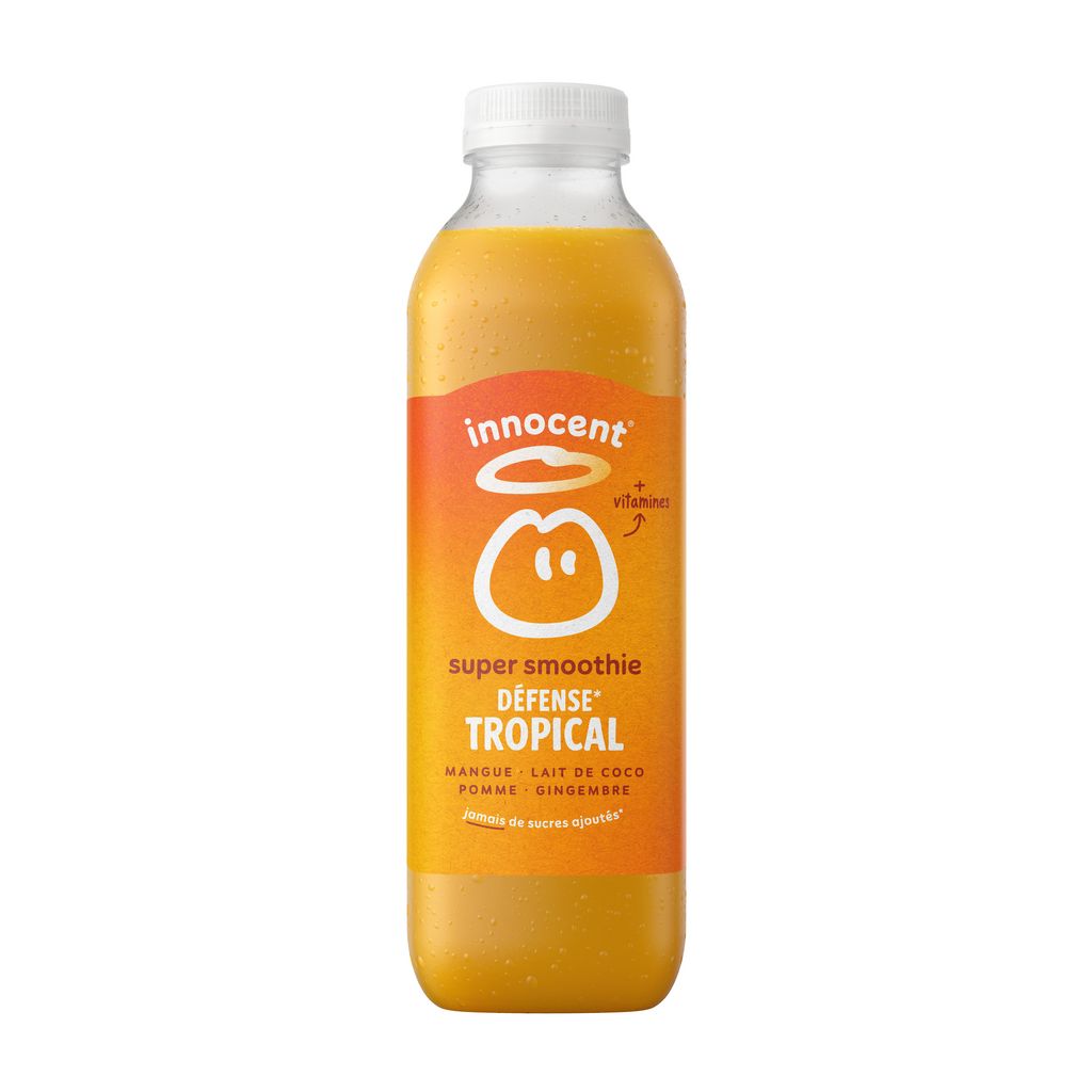 Ce super smoothie innocent est un mélange de fruits mixés, de jus de fruits, d’infusion de gingembre, de fibres d’agrumes et de vitamines ajoutées.