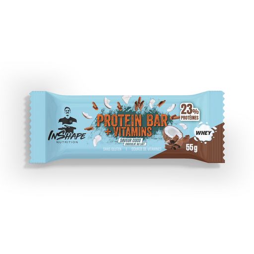 Barre protéinée source de vitamines, enrobée de chocolat au lait aromatisée noix de coco.