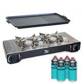 Kit Plancha Gaz 2en1 Complet - Réchaud 2 feux Inox 4400W + Plaque Grill + 4 Cartouches Gaz Butane Intérieur/Extérieur INTEC