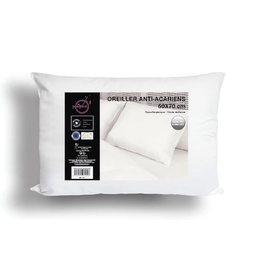 Coussin anti acarien CONFORT. Composition: enveloppe : Tissu non tissé garnissage: 100 % polyester fibre creuse siliconnée Certification Oeko-Tex Fabrication européenne