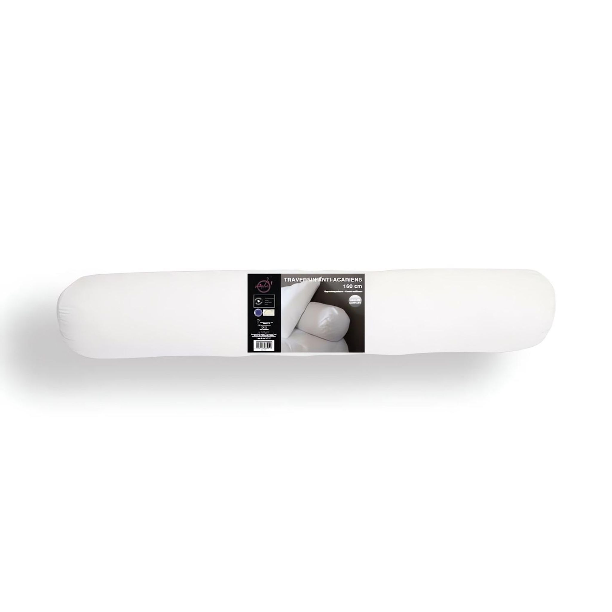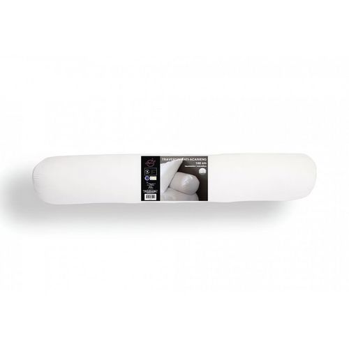 Traversin CONFORT anti acarien. Haute résilience. Couleur: Blanc. Composition: enveloppe : 100% polyester microfibre 85 Gr/m2, garnissage: 100 % polyester fibre creuse siliconnée 800 Gr. Lavable en machine Certification Oeko-Tex Fabrication européenne