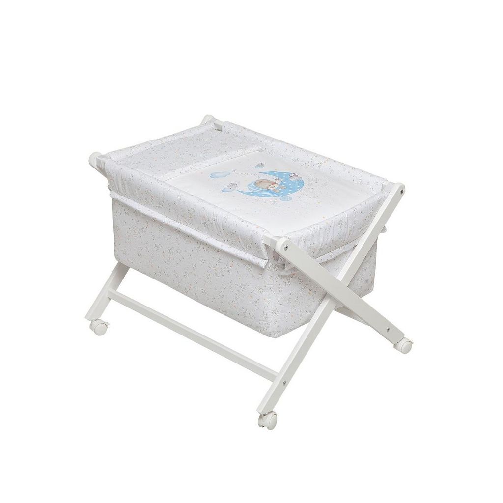 Découvrez le berceau en croix Bear Sleeping en bleu, conçu par Interbaby avec des matériaux de haute qualité pour garantir la sécurité et le confort de votre bébé. Ce berceau en hêtre blanc comprend une parure, une nacelle et un matelas, offrant tout le nécessaire pour un sommeil paisible. Avec des
