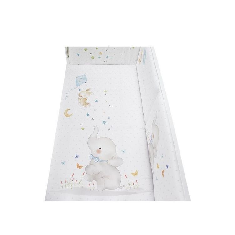 Contient : COORDONNE 2 PCS. AMOVIBLE - (COUETTE+TOUR DE LIT) MOD. Elephant - BLEU Couette avec garnissage amovible ? idéale pour une utilisation toute l'année, il suffit de retirer la ouate de silicone intérieure pendant les saisons plus chaudes. Tour de lit ? rembourré et amovible, offrant un couss
