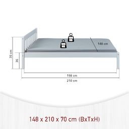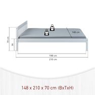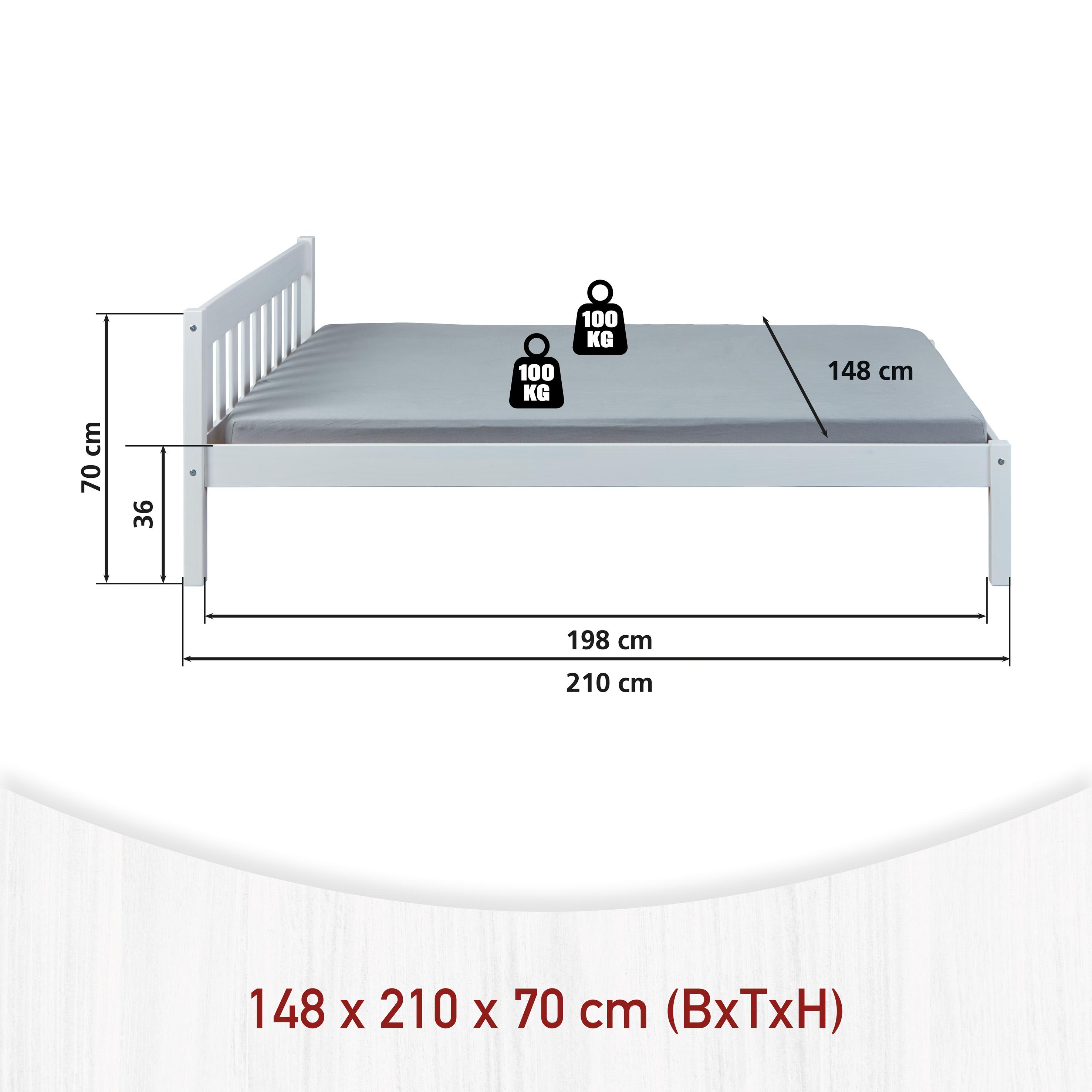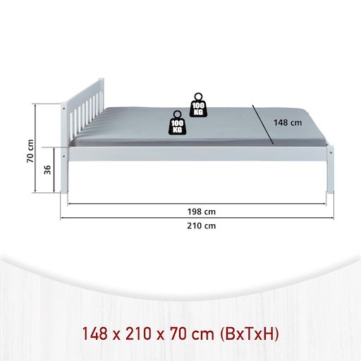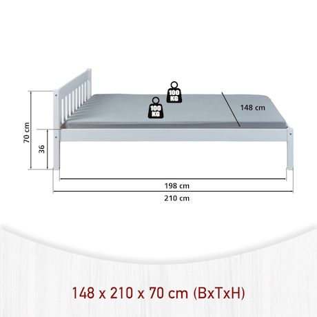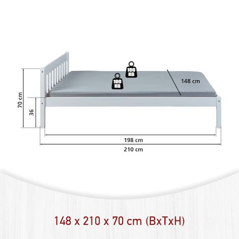 Le lit double Vilmar est disponible en différentes tailles. Ce lit offre suffisamment de place pour deux personnes. Grâce au bois massif utilisé, le lit double Vilmar promet une grande stabilité. Vilmar offre un repos et une nouvelle énergie pour votre départ quotidien ! Le lit double génère chaleur, bien-être et plaisir de dormir. Ce lit double noble se caractérise par une finition solide et un design intemporel. Grande stabilité et longue durée de vie - grâce au bois massif. Le lit double laqué blanc est facile à entretenir et hydrofuge. Les veines naturelles du bois sont visibles à travers le vernis blanc. Le bois de pin massif utilisé pour la fabrication de Vilmar répond aux normes de qualité européennes les plus récentes. Le lit double robuste convainc par sa grande résistance et sa finition solide. Sommier à lattes inclus : Non. Dimensions montées (LxPxH) : 210 x 148 x 70 cm.
