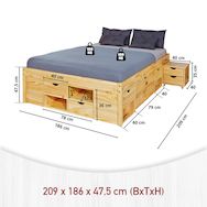 Le lit fonctionnel est idéal pour les pièces où l'espace est limité. Le lit fonctionnel Claas est particulièrement pratique. Les tiroirs sont de taille unique et peuvent être disposés selon vos souhaits. Pour éviter que la poussière ne s'accumule sous le lit, le lit fonctionnel est entièrement recouvert. Le lit est équipé de 4 tiroirs, de 2 grands tiroirs sur roulettes, de 12 étagères et de 2 chevets sur roulettes. Les housses de couette, les couvertures ou autres ustensiles peuvent être facilement et rapidement rangés sous le lit. La surface laquée transparente (naturelle) souligne le caractère chaleureux du bois naturel et protège le bois. Le vernis pauvre en substances nocives est hydrofuge et facile à entretenir. Le matériau utilisé (bois massif) répond aux normes de qualité européennes les plus récentes. Seule l'utilisation de matériaux sélectionnés permet d'obtenir un lit robuste et stable. Le lit fonctionnel Claas convainc non seulement par son gain de place, mais aussi par sa grande résistance. Le sommier à lattes est compris dans la livraison. Dimensions montées (LxPxH) : 209 x 186 x 47,5 cm. Une notice de montage illustrée est fournie.