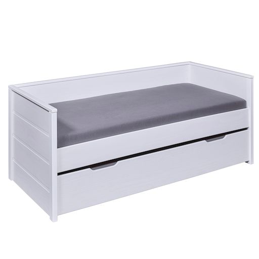 Dream the Future est un lit de jour qui se distingue par son design moderne et sa fonctionnalité. Le lit d'enfant 2 en 1 dispose d'un tiroir coulissant équipé d'une plaque de fond en MDF. Au choix, le tiroir peut être équipé d'un matelas (hauteur max. 12 cm) ou être utilisé comme tiroir de rangement pratique pour ranger le linge de lit. Le lit fonctionnel est en bois massif (pin) laqué blanc. Les veines typiques du bois véritable de pin à encens sont visibles à travers le vernis, ce qui souligne le charme naturel du lit d'enfant. Le matériau utilisé répond aux normes de qualité européennes les plus récentes et le vernis est facile à entretenir et hydrofuge. Dream the Future : pour faire de beaux rêves aujourd'hui et dans le futur. Sommier à lattes inclus.