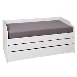 Que ce soit dans la chambre d'amis ou dans la chambre des enfants pour les plus jeunes et leurs « amis du soir », ce lit fonctionnel s'adapte à toutes les situations. Le lit fonctionnel en bois massif offre en un tour de main plusieurs surfaces de couchage et donc suffisamment de place pour rêver. Ce canapé-lit original dispose de trois places de couchage. En rabattant le cadre supérieur, on obtient un lit double. Une autre surface de couchage peut être retirée au besoin, comme un tiroir. La laque blanche est résistante, facile à entretenir et hydrofuge. Les veines naturelles du bois sont visibles à travers le vernis. Le bois de pin massif utilisé pour la fabrication de Lotar répond aux normes de qualité européennes selon les exigences les plus récentes. Le lit fonctionnel robuste convainc par sa grande résistance et sa finition solide. Sommier à lattes inclus : Oui. Dimensions montées (LxPxH) : 97 x 209 x 65 cm.