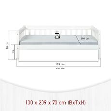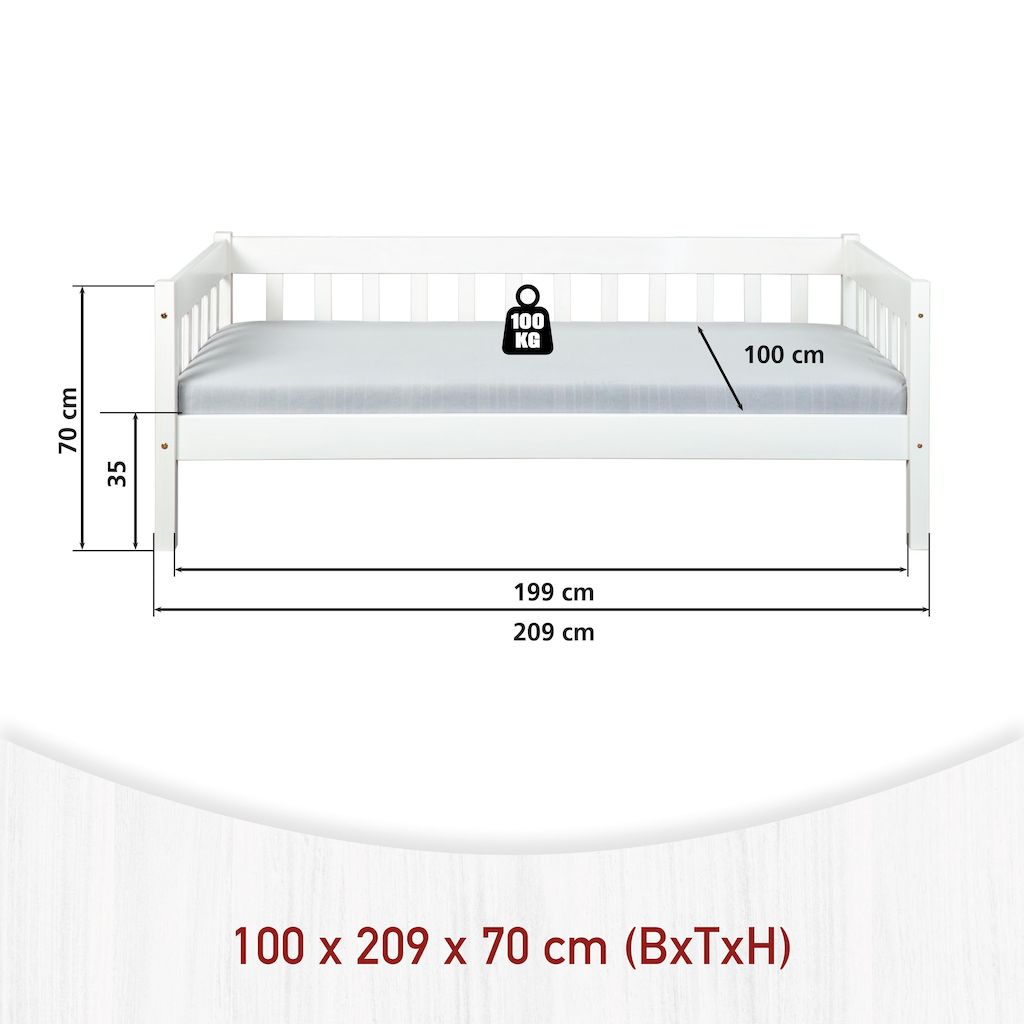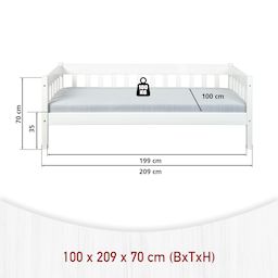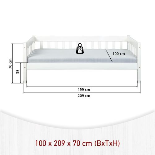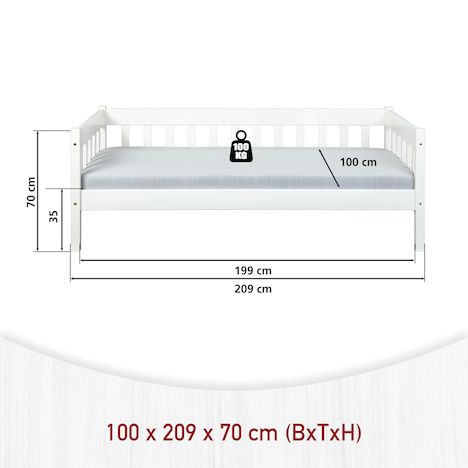 Découvrez le lit de table SINTRO, un lit simple qui correspond à l'esprit du temps et qui convient aux petits espaces. Il est fabriqué en bois massif laqué blanc et convient parfaitement à une chambre d'enfant ou d'amis. Les veines du bois sont visibles sous la couche de vernis, ce qui confère à ce produit une véritable valeur ajoutée. Un lit robuste qui résiste au temps. Nos tiroirs de lit UMEA sont entièrement compatibles avec ce lit (voir photos) et vous permettent soit d'utiliser un espace de rangement supplémentaire (draps, couvertures, jouets, livres, accessoires), soit d'y placer un matelas afin d'offrir un couchage supplémentaire. Sommier à lattes : Oui. Le produit doit être assemblé par vos soins. Des instructions illustrées étape par étape pour le montage sont fournies.
